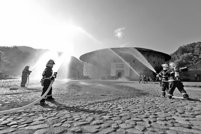 消防隊員在福建省龍巖市永定土樓進行滅火救援演練。新華社發(fā)