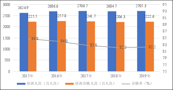 年培訓合格人次反映出我國駕培行業(yè)的培訓質量狀態(tài),由圖可知,我國年培訓合格人次基本保持在2200萬左右,培訓合格率基本維持在82%,但需要說明的是,近5年來我國駕培行業(yè)每年的培訓合格率逐年呈小幅下降的趨勢,這客觀反映出當前我國駕培行業(yè)的培訓質量逐年下降,仍需要各方積極采取措施,提升培訓質量。