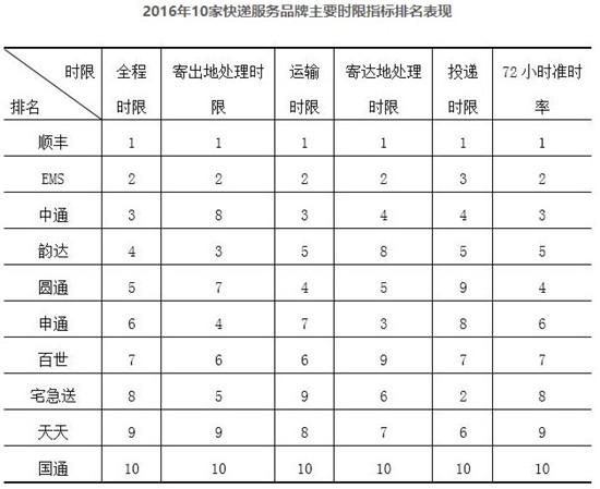 在國(guó)家郵政局《關(guān)于2016年快遞服務(wù)滿意度調(diào)查結(jié)果的通知》中,快遞企業(yè)總體滿意度排名和得分前五名依次為:順豐速運(yùn)(84.6分)、郵政EMS(80.0分)、中通快遞(76.9分)、圓通速遞(74.8分)、申通快遞(74.7分),順豐速運(yùn)穩(wěn)居第一。而在另一份國(guó)家郵政局《關(guān)于2016年快遞服務(wù)時(shí)限準(zhǔn)時(shí)率測(cè)試結(jié)果的通告》中,民營(yíng)快遞企業(yè)順豐速運(yùn)成為了快遞服務(wù)品牌主要時(shí)限指標(biāo)的標(biāo)桿。