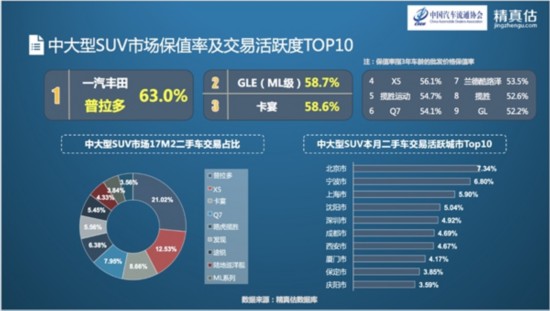 中大型SUV市場,在較慢的產(chǎn)品更新節(jié)奏及特定客戶群的背景下,整體表現(xiàn)平穩(wěn)。榜首的普拉多既是保值冠軍又是交易冠軍,隨著普拉多國產(chǎn)車型停產(chǎn)的消息,短期內(nèi)保值率將繼續(xù)堅挺。