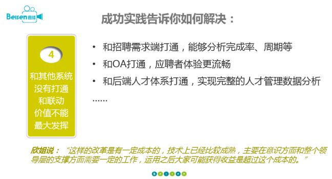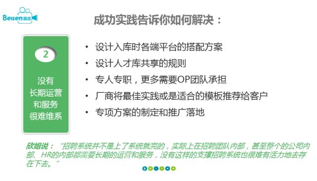 就像剛才談到的運(yùn)營(yíng)方面,并不是上了招聘系統(tǒng)就完事兒的,實(shí)際上在招聘團(tuán)隊(duì)內(nèi)部,甚至整個(gè)公司內(nèi)部、HR內(nèi)部都需要長(zhǎng)期的運(yùn)營(yíng)和服務(wù),沒(méi)有這樣的支撐,招聘系統(tǒng)也很難有活力存在下去。