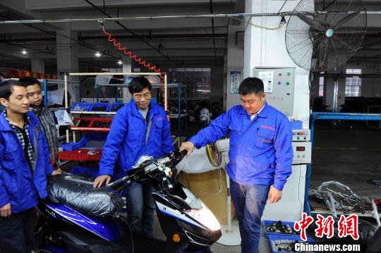 第一批投資貴港市電動車的梁文元,正與員工溝通如何提高電動車的質量!∈Y雪林 攝