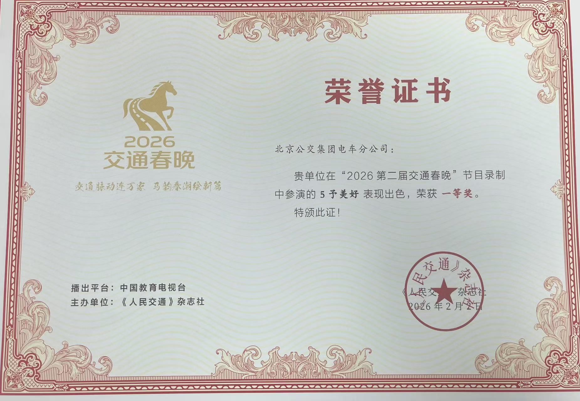 2026年2月2日晚,第二屆交通春節(jié)聯(lián)歡晚會在熱烈歡騰的氛圍中圓滿落幕。作為全國交通系統(tǒng)一年一度的文化盛事,本屆晚會匯集了來自各地交通單位的優(yōu)秀文藝作品,展現(xiàn)交通人昂揚向上的精神風貌。其中,北京公交集團選送的文化作品《5予美好》憑借獨具匠心的創(chuàng)意和深情飽滿的演繹,在眾多精品節(jié)目中脫穎而出,榮獲第二屆交通春晚“一等獎”。
