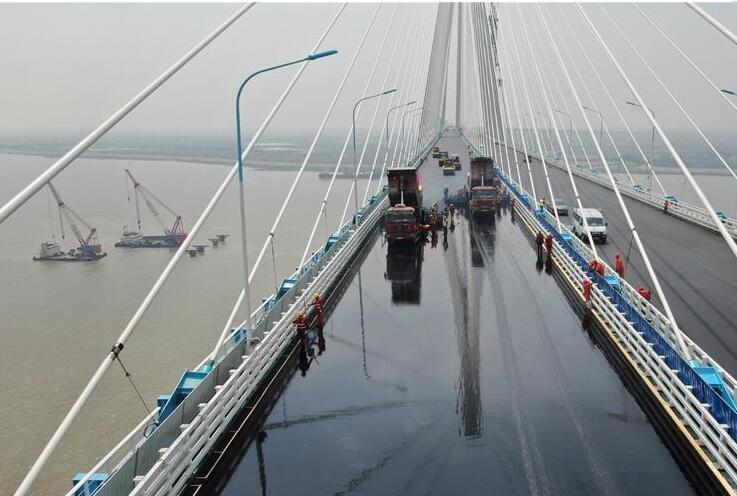 4月14日拍攝的滬通長(zhǎng)江大橋主航道橋橋面瀝青攤鋪現(xiàn)場(chǎng)(無(wú)人機(jī)照片)。 當(dāng)日,由中鐵大橋局承建的滬通長(zhǎng)江大橋主航道橋橋面瀝青攤鋪全部完工。 滬通長(zhǎng)江大橋?yàn)橥F路全線的控制性工程,全長(zhǎng)11072米,主橋采用雙塔斜拉橋設(shè)計(jì),主跨1092米,是世界上首座跨度超千米的公鐵兩用斜拉橋。