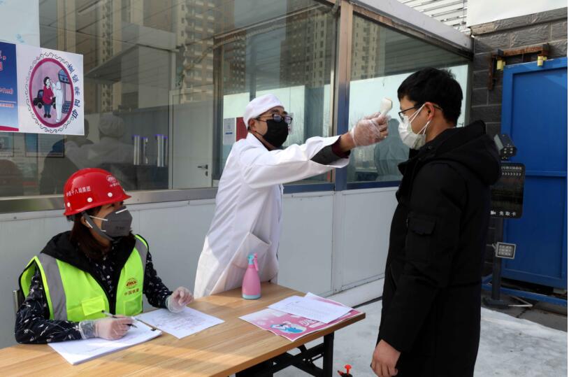 中鐵十八局集團(tuán)天津地鐵6號(hào)線項(xiàng)目部對(duì)進(jìn)入營(yíng)地人員測(cè)體溫(錢(qián)生澤 攝)