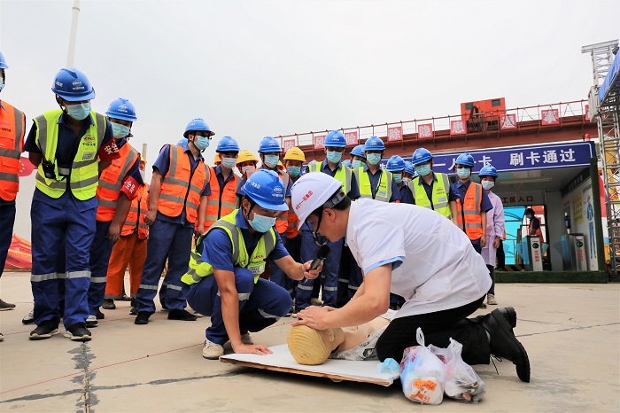 6月19日,武漢地鐵集團在由中鐵十一局承建的武漢地鐵16號線川沌區(qū)間現(xiàn)場開展了防洪搶險應(yīng)急演練。圖為醫(yī)生在現(xiàn)場進行心肺復(fù)蘇急救培訓(xùn)。(攝影/唐里)