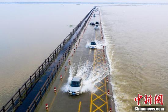 5月24日,受近期持續(xù)強(qiáng)降雨影響,位于江西省九江市永修縣境內(nèi)的永吳公路大湖池段被上漲的湖水漫過,形成了一道獨特的“水上公路”景觀,不少游客駕車慕名而來。永吳公路大湖池段全長5.05公里,每年入汛期間,中國最大淡水湖鄱陽湖水位迅猛上漲,水位達(dá)到18.70米時,就會漫過永吳公路大湖池段,形成了一道奇特的水上公路景觀。