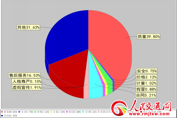 根據(jù)投訴性質(zhì)(如表1、圖1所示)分類,在所有投訴問題中,質(zhì)量問題占39.80%,其他問題占31.63%,售后服務(wù)問題占16.53%,合同問題占5.21%,價格問題占2.12%,虛假宣傳問題占1.91%,計量問題占1.02%,假冒問題占0.88%,安全問題占0.75%,人格尊嚴問題占0.15%。產(chǎn)品質(zhì)量、其他和售后服務(wù)問題仍是引發(fā)投訴的主要原因,占投訴總量的87%以上。