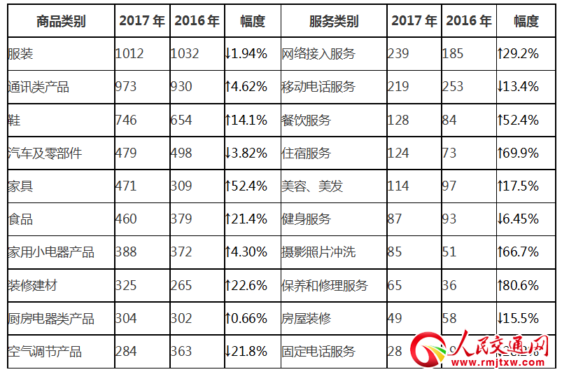 2017年在商品類投訴中,服裝、通訊類產(chǎn)品、鞋、汽車及零部件、家具等投訴量居前。其中,家具的投訴量同比增長52.4%,由2016年的309件增加到2017年的471件。