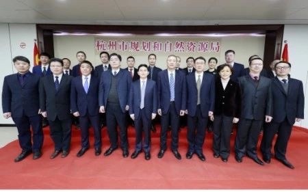 會后,杭州市委常委、副市長劉國洪和市政府副市長繆承潮為杭州市規(guī)劃和自然資源局揭牌,并與局領導班子成員合影留念。