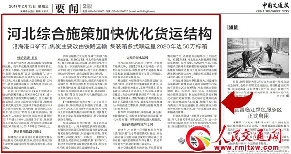 2月13日,《中國交通報》2版頭條以《河北綜合施策加快優(yōu)化貨運結(jié)構(gòu)》為題,報道了我省推進運輸結(jié)構(gòu)調(diào)整實施的一系列舉措。