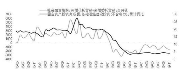 圖為新增信托貸款、新增委托貸款當(dāng)月值與基建投資額累計(jì)同比(單位:億元、%)