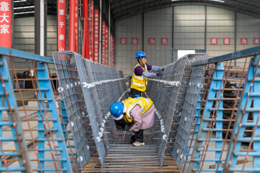 在項(xiàng)目預(yù)制梁場(chǎng),各作業(yè)區(qū)有序聯(lián)動(dòng)、高效運(yùn)轉(zhuǎn)。鋼筋加工區(qū)內(nèi),工人專注進(jìn)行焊接作業(yè),精準(zhǔn)綁扎成型;模板區(qū)內(nèi),技術(shù)人員嚴(yán)格檢查平整度與拼接精度,嚴(yán)把預(yù)制構(gòu)件基礎(chǔ)質(zhì)量關(guān);混凝土澆筑區(qū)內(nèi),攪拌車、輸送泵協(xié)同作業(yè),振搗密實(shí)、規(guī)范養(yǎng)護(hù)。存梁區(qū)內(nèi),100多片成品預(yù)制梁整齊排布,儲(chǔ)備充足、保障有力,為全線橋梁施工提供穩(wěn)定支撐。