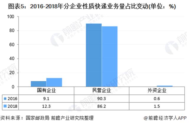 從企業(yè)性質(zhì)來看,近年來民營企業(yè)快遞業(yè)務(wù)量占比有所下滑。2018年,民營企業(yè)快遞業(yè)務(wù)量占總快遞量的86.2%,較2016年下降4.1個(gè)百分點(diǎn)。國有企業(yè)及外資企業(yè)快遞業(yè)務(wù)量占比有所上升。