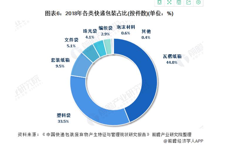 2019年,全國635.2億件快遞中,紙質(zhì)包裝快遞占比約為58.6%(按2018年占比,包含瓦楞紙箱、文件袋、套裝紙箱),塑料包裝快遞占比約為41.1%(包含塑料袋、珠光袋、編織袋、泡沫材料),其它類型占比0.4%。
