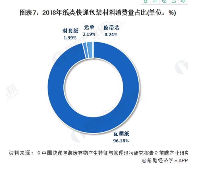 按照按照材質(zhì)類型,可將快遞包裝材料分為紙質(zhì)類和塑料類。2018年我國共消耗紙質(zhì)類快遞包裝材料856.05萬噸,占快遞包裝材料的90.95%;塑料類包裝材料85.18萬噸,占快遞包裝材料的9.05%。