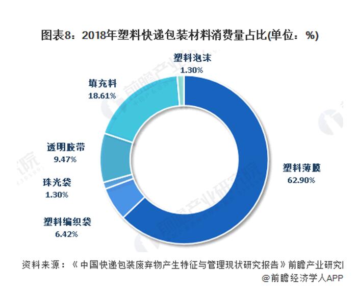 其中紙質(zhì)包裝以瓦楞紙為主,占比高達(dá)96.18%;塑料類包裝材料主要包括塑料袋薄膜(不包括珠光袋和填充薄膜塑料)、編織袋、泡沫箱、珠光袋、膠帶和填充塑料等,其中普通塑料袋薄膜占比最高,質(zhì)量占比達(dá)62.90%。對于快遞塑料袋薄膜,約占質(zhì)量比例的80%是由廢料再生的,其廢棄物容易造成環(huán)境污染。