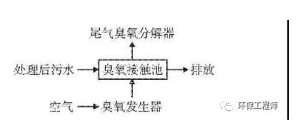 2)污水臭氧處理工藝。臭氧氧化能力強(qiáng),且很不穩(wěn)定,也無(wú)法儲(chǔ)藏,因此應(yīng)根據(jù)需要就地生產(chǎn)。臭氧的制備一般有紫外輻射法、電化學(xué)法和電暈放電法。目前臭氧制備占主導(dǎo)地位的是電暈放電法。由臭氧發(fā)生器制備好的臭氧氣體通過(guò)管道輸送到密閉的臭氧接觸池,與處理后的污水進(jìn)行接觸反應(yīng)。反應(yīng)后的氣體由池頂匯集后,經(jīng)收集器離開(kāi)接觸池,進(jìn)入尾氣臭氧分解器,在此剩余臭氧氣體被分解成氧氣排入大氣中(見(jiàn)圖2)。