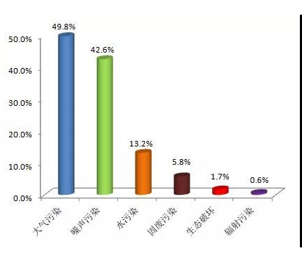 從污染類型來(lái)看,10月大氣污染舉報(bào)較多,占舉報(bào)總量的49.8%,噪聲污染、水污染、固廢污染、生態(tài)破壞和輻射污染舉報(bào)分別占42.6%、13.2%、5.8%、1.7%和 0.6%。