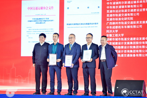 在團(tuán)體標(biāo)準(zhǔn)發(fā)布環(huán)節(jié),中國(guó)交通運(yùn)輸協(xié)會(huì)副會(huì)長(zhǎng)、中國(guó)交通運(yùn)輸協(xié)會(huì)標(biāo)準(zhǔn)化技術(shù)委員會(huì)副主任委員褚飛躍發(fā)表講話(huà),回顧了協(xié)會(huì)團(tuán)標(biāo)工作開(kāi)展情況,正式對(duì)外發(fā)布由協(xié)會(huì)新技術(shù)分會(huì)組織發(fā)起的《城市軌道交通數(shù)據(jù)采集平臺(tái)技術(shù)規(guī)范》《單軸轉(zhuǎn)向架跨座式單軌車(chē)輛通用技術(shù)條件》《自動(dòng)導(dǎo)向軌道交通車(chē)輛通用技術(shù)條件》三項(xiàng)團(tuán)體標(biāo)準(zhǔn),并向團(tuán)標(biāo)起草組代表中車(chē)浦鎮(zhèn)阿爾斯通運(yùn)輸系統(tǒng)有限公司、中國(guó)鐵道科學(xué)研究院集團(tuán)有限公司頒發(fā)團(tuán)體標(biāo)準(zhǔn)發(fā)布公告文件。