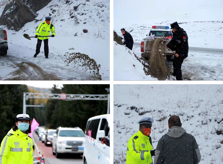 路因山回環(huán),山因路韻致;秋景繽紛美,冬雪入約至。喀納斯的路在山路間起起伏伏,彎彎轉(zhuǎn)轉(zhuǎn)。當(dāng)雪降臨,白雪勾勒山林,水墨意韻成畫(huà),美不勝收。山路幽幽是美景,一場(chǎng)雪讓路面變得濕滑,也是安全隱患所在。10月5日上午,從凌晨3時(shí)起至11時(shí),喀納斯景區(qū)公安局交警大隊(duì)民警王文已經(jīng)在S232線賈登峪至52公里執(zhí)勤點(diǎn)往返巡邏了4個(gè)來(lái)回,及時(shí)報(bào)送天氣情況及路況。當(dāng)雪越下越大,道路通行變差后,他立即投入到道路安全保障中,開(kāi)始和戰(zhàn)友們一起在結(jié)冰路面拋灑防滑沙,時(shí)而去路面指揮疏導(dǎo),一邊指揮車輛,一邊向駕駛員叮囑冰雪路面注意事項(xiàng)。等到天氣轉(zhuǎn)晴,路面積雪融化,車輛可以暢行時(shí),他又前往其他路段支援工作去了。雖然早餐和午餐都沒(méi)有吃東西,將近24小時(shí)沒(méi)有休息,但身為一名交警看著濕滑的路面,他仍然堅(jiān)持在一線疏導(dǎo)交通。他是一個(gè)普普通通的人,也是一名平凡崗位上的人民警察,因?yàn)轭^頂警徽,身著藏藍(lán),生命里就刻上了若牛重負(fù)的使命感,寢食難安的責(zé)任感。