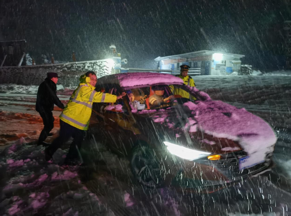 2月9日(農(nóng)歷大年初九)凌晨4:50,降雪已暫停,縣域內(nèi)結(jié)冰易打滑路段路段已撒鹽融雪,其他路面還有少量積雪,四驅(qū)車可通行無阻,兩驅(qū)車不上防滑鏈可緩慢通行。大隊(duì)執(zhí)法人員在阿拉牛堰疫情防控卡點(diǎn)至梯子坎路段夜巡時發(fā)現(xiàn)有2臺大貨車因拋瞄暫時滯留,便立即為其設(shè)置警示錐桶,并要求靠邊停放好,以免造成交通堵塞,待路面進(jìn)一步融雪后再行駛。當(dāng)天,縣域內(nèi)國省道干線及主要公路路段通行狀況總體良好,未發(fā)現(xiàn)擁堵斷道情況。