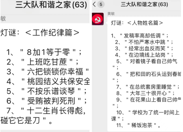 “這兩篇謎語共有18條。制作這些謎語,一是為慶祝我們國家的傳統(tǒng)節(jié)日元宵節(jié),二是把工作中的紀(jì)律規(guī)定以寓教于樂的方式,加深民警們的認識,進而推動和諧警隊建設(shè)。”黃敏介紹道。