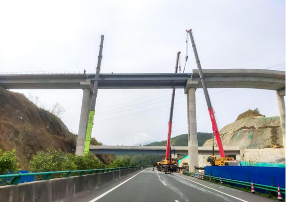 此次鋼箱梁架設(shè)需上跨蘭海高速(廣甘段)主干道施工,時(shí)間緊、任務(wù)重,梁體垂直提升高度近30米,是該項(xiàng)目最后一處“危大”工程。為確保箱梁安全精準(zhǔn)架設(shè),該項(xiàng)目成立攻堅(jiān)團(tuán)隊(duì),深入現(xiàn)場(chǎng)調(diào)查研究,多次組織召開專題會(huì)議,優(yōu)化吊裝方案,認(rèn)真做好施工前的技術(shù)交底,使作業(yè)人員能熟練掌握技術(shù)規(guī)程和操作規(guī)范。同時(shí),搶抓作業(yè)有利窗口期,將蘭海高速(廣甘段)道路車輛分流至在建廣平高速匝道繞行,采用3臺(tái)吊車同時(shí)協(xié)作施工,經(jīng)過11個(gè)小時(shí)的緊張作業(yè),“落梁”作業(yè)圓滿完成。