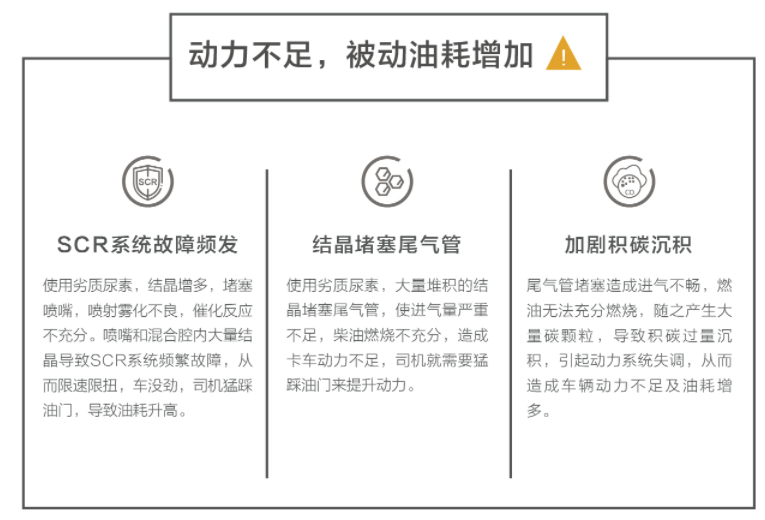 現(xiàn)有常規(guī)型車、船用尿素?zé)o法徹底解決“結(jié)晶”弊端,使SCR系統(tǒng)處理功能受限,催化劑活性和使用壽命大幅降低,并且因?yàn)榻Y(jié)晶堵塞問題,造成多種“并發(fā)癥”,直觀表現(xiàn)為車輛動力不足、油耗上升、積碳增多。這其實(shí)是由于尾氣管堵塞影響了車輛排氣,從而影響進(jìn)氣,進(jìn)氣不暢導(dǎo)致缺氧,使柴油機(jī)燃燒室燃燒不充分,造成大量碳顆粒沉積,最終導(dǎo)致動力下降、油耗攀升。