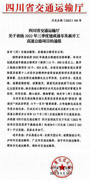 9月30日,四川省交通運(yùn)輸廳發(fā)出通報(bào):廣平高速項(xiàng)目項(xiàng)目公司——四川北新天曌投資發(fā)展有限公司受到通報(bào)表?yè)P(yáng);同日,四川省交通運(yùn)輸廳官網(wǎng)發(fā)布公告:廣平高速項(xiàng)目投資人——新疆北新路橋集團(tuán)股份有限公司被評(píng)為四川省高速公路投資人2021年度信用評(píng)價(jià)“A”級(jí)。廣平高速項(xiàng)目自開工以來(lái),始終面對(duì)高橋隧比、高地震烈度、高地應(yīng)力和軟弱圍巖“三高一軟”的工程特點(diǎn),先后迎戰(zhàn)川西北2018百年一遇特大洪災(zāi)、全球2020突如其來(lái)新冠疫情,特別是2022年積極應(yīng)對(duì)全線范圍的疫、洪、旱、高溫、限電、地震交織疊加的“六重考驗(yàn)”,新疆北新路橋集團(tuán)股份有限公司秉持“誠(chéng)實(shí)守信、追求卓越”的企業(yè)價(jià)值觀,圓滿完成投資任務(wù),充分彰顯了國(guó)企擔(dān)當(dāng);四川北新天曌投資發(fā)展有限公司充分發(fā)揮項(xiàng)目管理主導(dǎo)作用,團(tuán)結(jié)帶領(lǐng)全體參建單位和人員發(fā)揚(yáng)“兵團(tuán)精神”,攻堅(jiān)克難、頑強(qiáng)拼搏,實(shí)現(xiàn)項(xiàng)目青川段提前通車運(yùn)營(yíng),創(chuàng)造了“北新速度”。