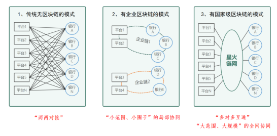 祁富雷稱(chēng):“星火產(chǎn)融=星火·鏈網(wǎng)+產(chǎn)融協(xié)同,在一個(gè)區(qū)塊鏈基礎(chǔ)設(shè)施上來(lái)解決產(chǎn)業(yè)端和金融端之間的協(xié)同效應(yīng)”。在這個(gè)體系中,各類(lèi)產(chǎn)業(yè)端平臺(tái)、各類(lèi)金融端平臺(tái)以及其他數(shù)據(jù)服務(wù)來(lái)源平臺(tái),將能夠達(dá)成多對(duì)多的網(wǎng)狀協(xié)作能力。相比傳統(tǒng)模式的“一對(duì)一調(diào)用”,這個(gè)體系實(shí)現(xiàn)了基于數(shù)字信任的分布式“多對(duì)多互通”。