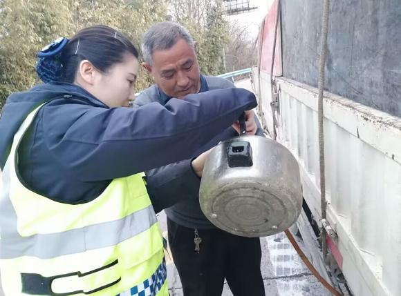 說(shuō)來(lái)也巧,當(dāng)班班長(zhǎng)王雪萍就像一顆 “定心丸” 及時(shí)出現(xiàn)。當(dāng)時(shí),她正在廣場(chǎng)巡邏,銳利的目光瞬間捕捉到了停在匝道上的貨車。她立即上前詢問(wèn)情況。了解到貨車是因?yàn)闆](méi)油拋錨后,王雪萍先是手腳麻利地在車輛四周擺好警示錐筒,隨后,她又提醒司機(jī)師傅打開(kāi)雙閃燈。做完這些“規(guī)定動(dòng)作”后,王雪萍看著司機(jī)焦急的模樣,安慰道:“師傅,您別慌!咱管理所附近就有加油站,我陪您跑一趟。”