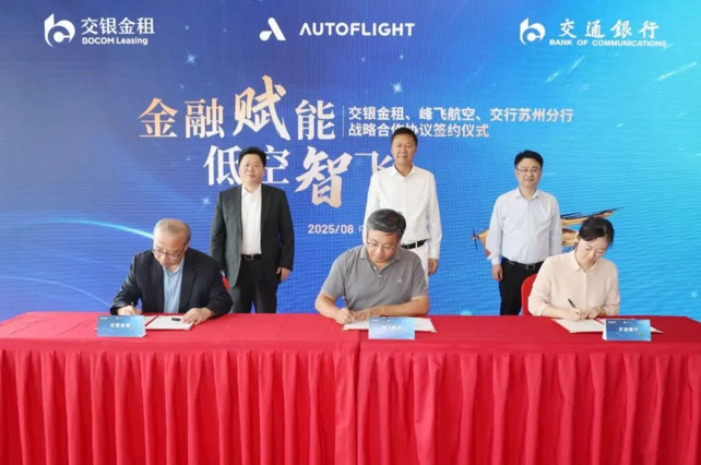 8月1日,交銀金租與峰飛航空科技、交通銀行蘇州分行簽署戰(zhàn)略合作協(xié)議。交通銀行首席專(zhuān)家、交銀金租黨委書(shū)記、董事長(zhǎng)徐斌,峰飛航空科技創(chuàng)始人、董事長(zhǎng)田瑜,交通銀行蘇州分行黨委書(shū)記、行長(zhǎng)毛彬,交銀金租黨委副書(shū)記、總裁竺葉群、峰飛航空科技首席商務(wù)官李云出席簽約儀式。交銀金租黨委委員、副總裁、資深專(zhuān)家吳家駿,交通銀行蘇州分行黨委委員、副行長(zhǎng)江潔,峰飛航空科技高級(jí)副總裁謝嘉代表各方簽約。