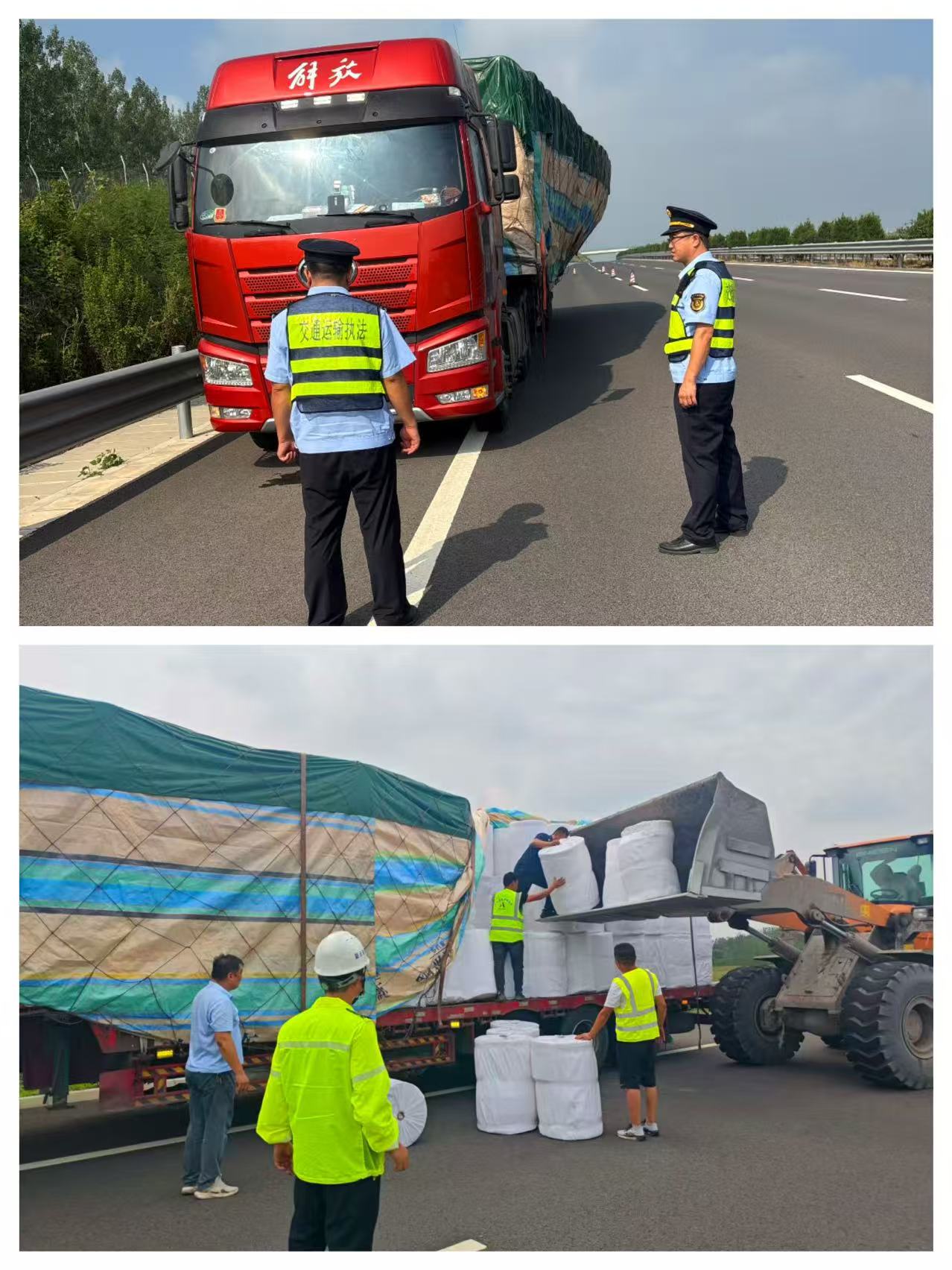 當(dāng)天上午9時10分左右,濰坊市交通運輸綜合執(zhí)法支隊濰青高速大隊執(zhí)法人員巡查至青商高速65K處,發(fā)現(xiàn)一輛蘇籍半掛大貨車貨物嚴重傾斜,車輛緩慢?吭诹顺嚨郎,情況十分危急。執(zhí)法人員見狀,立即停車打開警笛,迅速劃定警戒區(qū)域,布設(shè)安全反光錐,對現(xiàn)場實施臨時交通管制,指揮過往車輛緩慢通行,注意躲避,并通過高速公路“一路多方”聯(lián)勤聯(lián)動平臺,將現(xiàn)場情況反饋給青商高速路管大隊和養(yǎng)護中心,得到兩方及時響應(yīng),迅速調(diào)集人員設(shè)備到達現(xiàn)場施救。三方人員采取“先卸載、后轉(zhuǎn)運”的方案,經(jīng)過3個多小時的緊張作業(yè),傾斜貨物被安全卸載并轉(zhuǎn)運,大貨車也安全駛離現(xiàn)場,道路恢復(fù)正常通行。