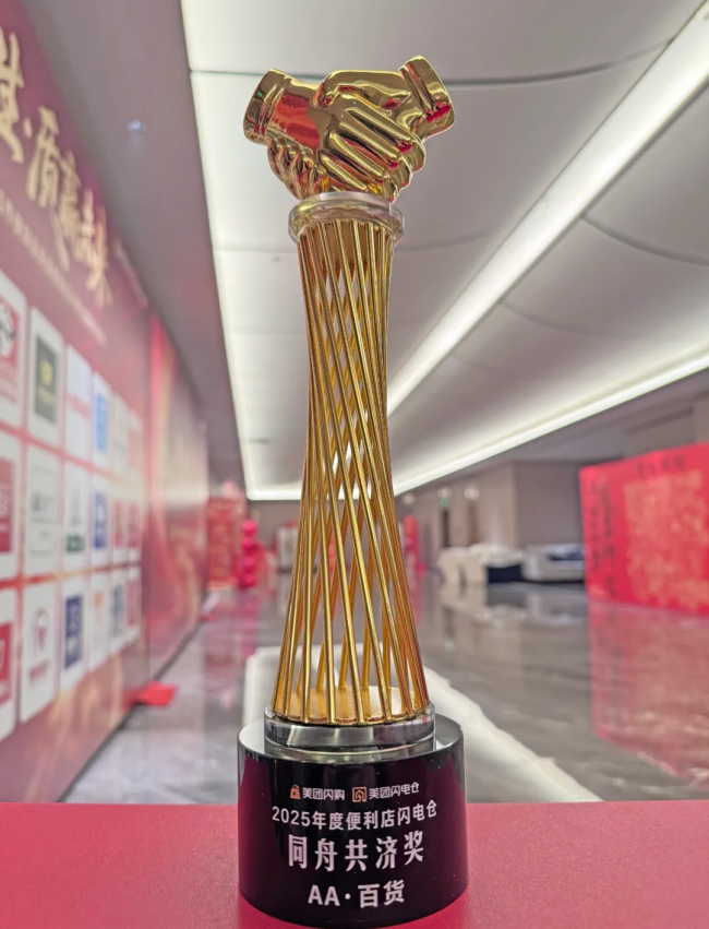 AA·百貨在美團(tuán)便利店閃電倉(cāng)評(píng)選中再創(chuàng)佳績(jī),一舉拿下2025年度便利店閃電倉(cāng)年度十大品牌與2025年度便利店閃電倉(cāng)同舟共濟(jì)獎(jiǎng)兩大殊榮,彰顯純線上閃電倉(cāng)模式的硬核實(shí)力與行業(yè)生態(tài)共建的標(biāo)桿價(jià)值。