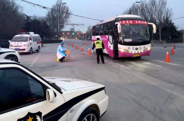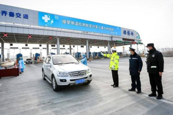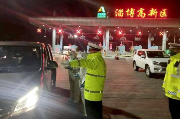 臨淄交警在高速出入口排查車輛防控疫情。