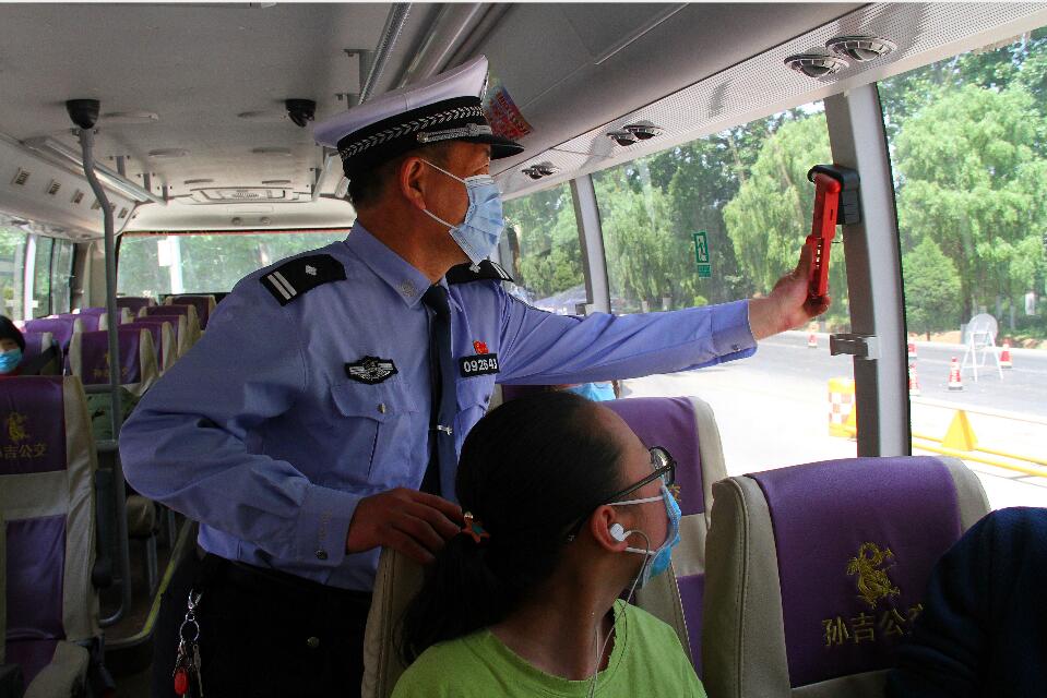 山西臨猗交警大隊臨晉中隊民警在執(zhí)法站堅守崗位,對過往面包車、客車進行檢查,提醒乘客一定要系好安全帶,做好個人安全防護措施。(王惠兵)