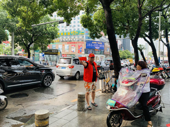 “阿姨,請(qǐng)往旁邊人行道過(guò)馬路。”近日,在懷化市“步步高”、火車站處等交通繁忙的十字路口,四名頭戴“小紅帽”的年輕人正在維護(hù)交通秩序,并勸導(dǎo)行人有序橫過(guò)馬路,他們是懷化鐵路乘警支隊(duì)的民警。此刻,他們把自己化身為城市交通勸導(dǎo)員。