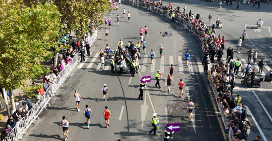 大型活動(dòng)交通保障中,南京交警同樣交出亮眼答卷。此前多場(chǎng)綠茵賽事齊聚金陵,交警部門(mén)推出VR實(shí)景“云上導(dǎo)覽”,通過(guò)點(diǎn)對(duì)點(diǎn)推送交通出行提示,做實(shí)停車引導(dǎo)、圈層管控等措施,實(shí)現(xiàn)觀眾“無(wú)感有序入場(chǎng)、最快23分鐘絲滑散場(chǎng)”,打造了大型活動(dòng)疏散的新標(biāo)桿。而在南京馬拉松期間,交警部門(mén)更精細(xì)設(shè)置95處穿越點(diǎn),首創(chuàng)“島式穿越”模式,在不影響賽事正常運(yùn)行的前提下,最大程度方便市民出行。這一創(chuàng)新舉措獲得廣泛贊譽(yù),央視銳評(píng)道:“南馬‘島式穿越’獲贊!建議全國(guó)推廣”,成為城市治理智慧與民生溫度的最佳見(jiàn)證。