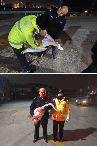 當(dāng)時,正值晚高峰,車流量較大。受傷的天鵝被車燈照射后,想掙扎著起飛,都沒有成功。它正要跑到道路上時,執(zhí)勤交警希爾艾力·阿卜來提、左金磊一個箭步?jīng)_了上去,左金磊指揮疏導(dǎo)交通,希爾艾力·阿卜來提抱住受傷的天鵝,才沒有發(fā)生意外交通事故和交通擁堵。