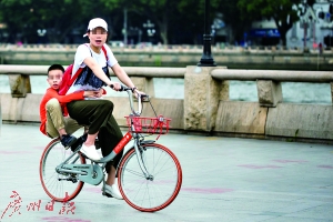 昌崗東路,大人騎著共享單車,小孩坐在車頭。