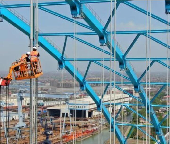 該航道橋采用“先梁后拱、主梁懸拼、拱肋轉(zhuǎn)體”的施工方案。鋼桁梁和主拱的重量總計(jì)3.24萬(wàn)噸,相當(dāng)于在橋面上每走一步,就跨越了50噸重的鋼結(jié)構(gòu)。