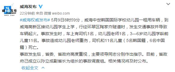 據(jù)山東省威海市人民政府新聞辦公室官方微博消息,5月9日8時(shí)59分,威海中世韓國(guó)國(guó)際學(xué)校幼兒園一租用車輛,到威海高新區(qū)接幼兒園學(xué)生上學(xué),行經(jīng)環(huán)翠區(qū)陶家夼隧道時(shí),發(fā)生交通事故并導(dǎo)致車輛起火。事故發(fā)生時(shí),車上有司機(jī)1名,幼兒園老師1名,3—6歲幼兒園學(xué)齡前兒童11名。事故造成幼兒園老師重傷,司機(jī)和11名兒童(5名韓國(guó)籍,6名中國(guó)籍)死亡。