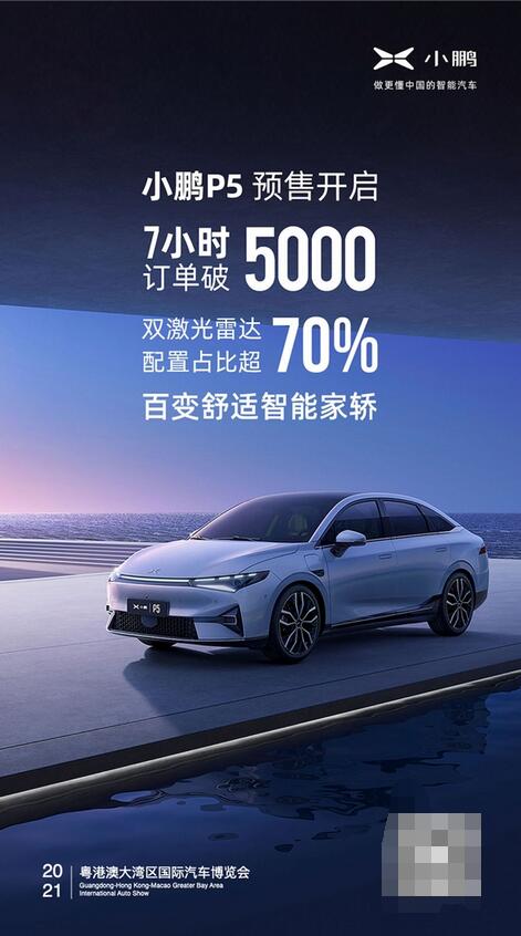 小鵬P5受鵬友認可,百變舒適智能家轎P5,預售7小時訂單破5000。感謝每一位鵬友的厚愛,我們將不負期待,與你一起開啟智能出行的新時代。
