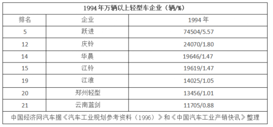 上世紀(jì)90年代初,一批地方企業(yè)以輕型車起步,出現(xiàn)了多家企業(yè)爭鋒的局面,其中,躍進(jìn)(南汽)、慶鈴、金杯(華晨集團(tuán)旗下)、江鈴、江淮、鄭州輕型和云南藍(lán)劍等企業(yè),在1994年的銷量都超過萬輛,市場份額大多高于百分之一。