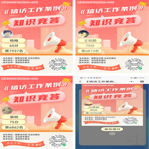此次知識競賽活動為線上答題形式進行,內(nèi)容涉及信訪條例、初信初訪辦理、信訪事項網(wǎng)上辦理等日常工作的業(yè)務(wù)知識,題型內(nèi)容豐富,重點突出,分值共計100分,職工在參與過程中熱情高漲,認真答題,掀起了股學(xué)習(xí)熱潮,在學(xué)習(xí)及答題的過程中對信訪業(yè)務(wù)知識特別是網(wǎng)上信訪業(yè)務(wù)知識、信訪案件網(wǎng)上辦理流程有了更為全面的理解和掌握。