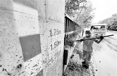 昨天一早,在旱河路鐵路橋,該下凹式橋梁位于地鐵6號(hào)線田村路站以北,京糧廣場(chǎng)的西北側(cè)。橋區(qū)共有四個(gè)橋洞,供機(jī)動(dòng)車行駛的主路為雙向六車道,中間用綠化帶隔開。這座鐵路橋地勢(shì)很低,坡度也比較陡,基本上是周邊地區(qū)的最低點(diǎn),橋體的欄桿上可以看到限高3.5米的標(biāo)識(shí),但沒有看到明顯的涉水警示牌。早上9時(shí),橋區(qū)內(nèi)積水已經(jīng)排空,路面滿是淤泥。海淀環(huán)衛(wèi)部門從凌晨5時(shí)起,派出6名環(huán)衛(wèi)工人用鐵鍬鏟泥,2輛灑水車對(duì)頭在主路上行駛,反復(fù)沖洗地面。據(jù)悉,在橋區(qū)主路下凹處畫有水位線,從橋柱上殘留的水痕和泥印可以看出,積水最深處將近2米。