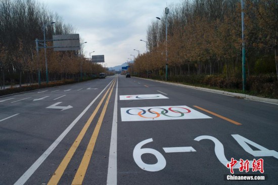 10月30日,北京延慶,道路上已施劃奧運專用道標識。近日,北京冬奧會延慶賽區(qū)各條主要干道,施工人員正在實施奧運專用道標志牌安裝收尾工作。