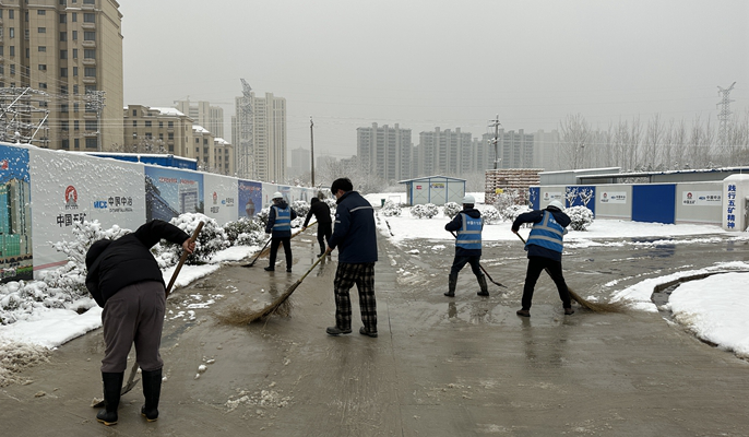 當(dāng)天早上天剛蒙蒙亮,鏟雪小分隊(duì)就已經(jīng)投入到緊張的鏟雪工作中。大家分工明確、齊心協(xié)力,頂著還未停止的落雪,手握掃把鐵鍬,干勁十足地對(duì)項(xiàng)目周邊道路積雪進(jìn)行清掃,冰天雪地里的“志愿紅”“中冶藍(lán)”成為皚皚白雪中一道靚麗的風(fēng)景線,路過(guò)的居民紛紛為這支掃雪大軍“點(diǎn)贊”。