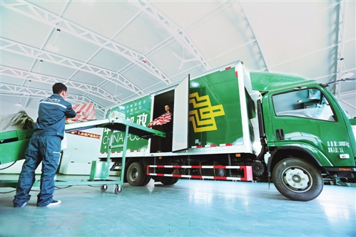 呼倫貝爾市莫力達(dá)瓦旗郵政分公司郵件處理中心,開往“最后一公里”的郵車正在裝車準(zhǔn)備出發(fā)!鯊堼埳 攝